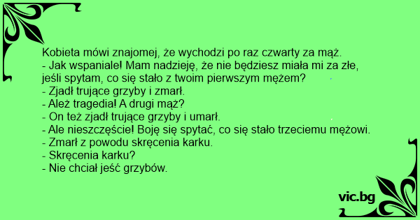 Печурки Working on the Fourth Husband Μανιτάρια Ε, δεν ήθελε να φάει τα μανιτάρια!!! Χήρος για τρίτη φορά - Ваши первые четыре мужа отравились грибами, пятый упал с лестницы. Как вы это объясните? - Τί έγινε ρε Μπάμπη, πώς πέθανε η πεθερά σου; - От какво умря първата ти жена? Разговор между двама мъже: Двама приятели си приказват: - Hur dog din första man! - Han åt giftig svamp. - Hur dog din andra man? - Han åt giftig svamp. - Hur dog din tredje man? - Honom slog jag ihjäl - Varför det? - Han vägrade äta min... Sag mal, wie geht es eigentlich dem Meier?" "Hat gerade seine dritte Frau beerdigt!" "Woran starb denn seine erste?" "Pilzvergiftung!" "Mein Gott, und die zweite?" "Pilzvergiftung!" "Mein Gott. Und... I domstolen: - Hur dog er första fru? - Hon åt giftig svamp. - Och er andra fru? - Hon åt också giftig svamp. - Den tredje då? - Hon blev ihjälslagen. - Hur gick det till? - Hon vägrade äta... No boteco, o bêbado desabafava com um amigo: — Tive três mulheres... As três morreram... — Sério? — pergunta o amigo, assustado — Mas como isso pôde acontecer? — A primeira comeu cogumelo... Un agente assicurativo viene invitato ad un matrimonio. Viene a sapere dagli altri invitati che quello è il quarto marito della sposa; così, incuriosito, non appena ha l’occasione di avvicinarsi a... Oficer NKWD przeprowadza inspekcję w podległej jednostce. W podziemiu koszar widzi trzy trupy. Pyta więc po kolei: - Ten, co? - Zmarł, bo zjadł trujące grzyby. - A ten? - Także zjadł trujące... Deux amis discutent ensemble, ils ne se sont plus vu depuis un bout de temps: - J'ai entendu que tu t'es remarié. - Oui, c'est ma quatrième fois. - Et les précédentes ? - Toutes mortes, toutes. -... Am ramas vaduva de 3 ori… povesteste o tanara de 35 de ani. - Cum se poate? Nu pot sa cred, se mira cineva. Toti trei? - Da, primii doi s-au otravit cu ciuperci. - Si al treilea? - A murit din... Twee vrienden die elkaar jaren niet gezien hadden komen elkaar tegen. En natuurlijk is de eerste vraag "Hoe gaat het met je". "Nou, niet zo goed eigenlijk", zegt de een, "Ik ben nu al voor de derde... Moteris giriasi savo draugei, kad ruošiasi tekėti jau ketvirtą kartą. - O kas atsitiko tavo pirmajam vyrui? – domisi draugė. - Suvalgė nuodingų grybų ir mirė. - O antrajam? - Suvalgė nuodingų grybų... Jim: „Slyšel jsem, že jsi se zase oženil?” Joe: „Ano. Počtvrté.” Jim: „A co se stalo s tvými předchozími manželkami?” Joe: „Všechny zemřeli.” Jim: „Jak se jim to stalo?” Joe: „Ta první se otrávila... Un signore si sta per sposare per la quarta volta e allora la fidanzata gli dice: - "Ma per che cosa è morta la tua prima moglie?" - "E poverina, ha mangiato i funghi avvelenati!" - "E la seconda?"... Olen ollut naimisissa kaksi kertaa, mies kertoi toiselle baaritiskillä. Ensimmäinen vaimoni kuoli syötyään myrkyllisiä sieniä ja toiselta vaimolta murtui pääkallo. Kauheaa, toinen mies päivitteli....
