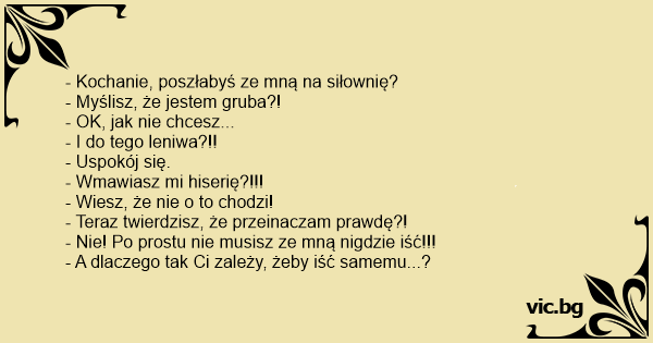 - Iubito, plec la sală. Ai vrea să mergi cu mine? - Îţi par grasă? - Dacă nu vrei să mergi, nu mergi! - Acum sunt şi leneşă? - Calmează-te, dragă! Nu am insinuat nimic! - Acum sunt şi isterică, nu?...
