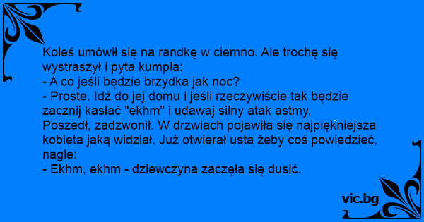 Koleś umówił się na randkę w ciemno. Ale trochę się wystraszył i pyta kumpla:
