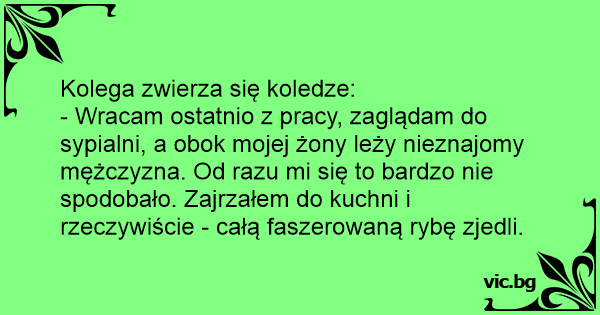 - Wracam ostatnio z pracy, zaglądam do sypialni, a obok mojej żony leży nieznajomy mężczyzna. Od razu mi się to bardzo nie spodobało. Zajrzałem do kuchni i rzeczywiście - całą faszerowaną rybę zjedli.