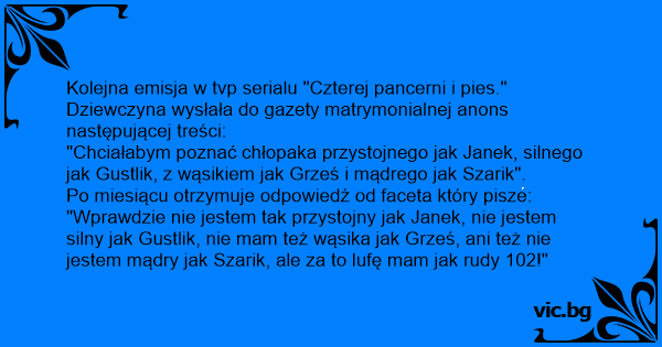 "Chciałabym poznać chłopaka przystojnego jak Janek, silnego jak Gustlik, z wąsikiem jak Grześ i mądrego jak Szarik".