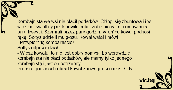 Kombajnista we wsi nie płacił podatków. Chłopi się zbuntowali i w wiejskiej świetlicy postanowili zrobić zebranie w celu omówienia paru kwestii. Szemrali przez parę godzin, w końcu kowal podnosi rękę. Sołtys udzielił mu głosu. Kowal wstał i mówi: