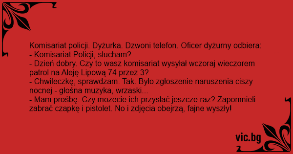 - Dzień dobry. Czy to wasz komisariat wysyłał wczoraj wieczorem patrol na Aleję Lipową 74 przez 3?