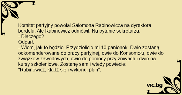 Komitet partyjny powołał Salomona Rabinowicza na dyrektora burdelu. Ale Rabinowicz odmówił. Na pytanie sekretarza: