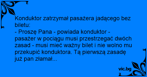- Proszę Pana - powiada konduktor - pasażer w pociągu musi przestrzegać dwóch zasad - musi mieć ważny bilet i nie wolno mu przekupić konduktora. Tą pierwszą zasadę już pan złamał...
