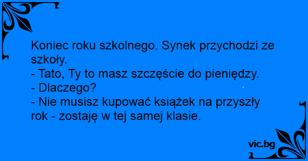 – Тату! У цьому навчальному році я вам зекономив багато грошей! – Який у мене розумний син! Як же ти це зробив? – Не будете мені купувати нових книжок. Я залишився на другий рік у цьому ж класі.