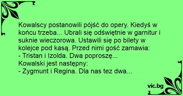 Kowalscy postanowili pójść do opery. Kiedyś w końcu trzeba... Ubrali się odświętnie w garnitur i suknie wieczorowa. Ustawili się po bilety w kolejce pod kasą. Przed nimi gość zamawia: