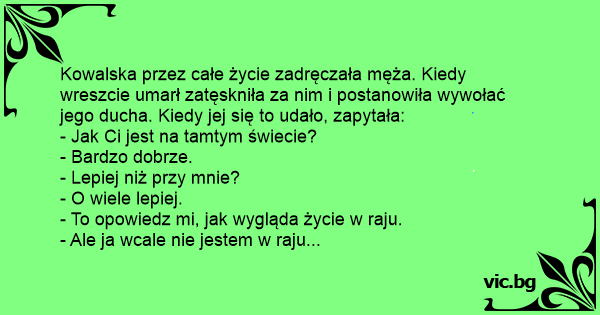 Kowalska przez całe życie zadręczała męża. Kiedy wreszcie umarł zatęskniła za nim i postanowiła wywołać jego ducha. Kiedy jej się to udało, zapytała: