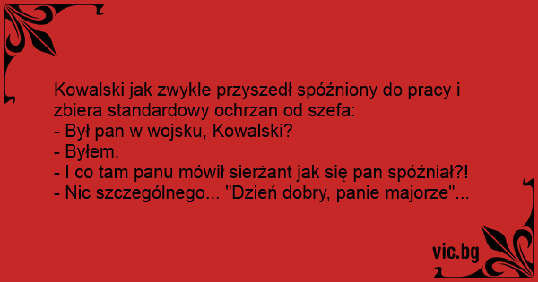 Kowalski jak zwykle przyszedł spóźniony do pracy i zbiera standardowy ochrzan od szefa: