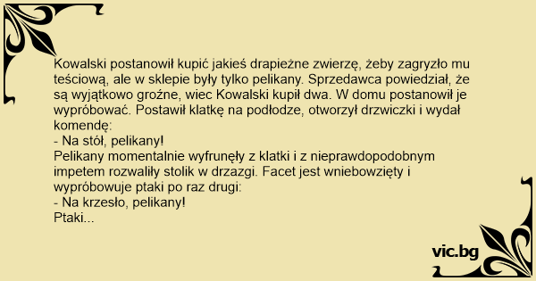 Kowalski postanowił kupić jakieś drapieżne zwierzę, żeby zagryzło mu teściową, ale w sklepie były tylko pelikany. Sprzedawca powiedział, że są wyjątkowo groźne, wiec Kowalski kupił dwa. W domu postanowił je wypróbować. Postawił klatkę na podłodze, otworzył drzwiczki i wydał komendę: