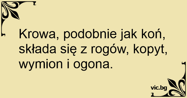Krowa, podobnie jak koń, składa się z rogów, kopyt, wymion i ogona.