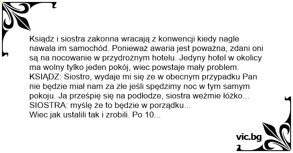 KSIĄDZ: Siostro, wydaje mi się ze w obecnym przypadku Pan nie będzie miał nam za złe jeśli spędzimy noc w tym samym pokoju. Ja prześpię się na podłodze, siostra weźmie łóżko...