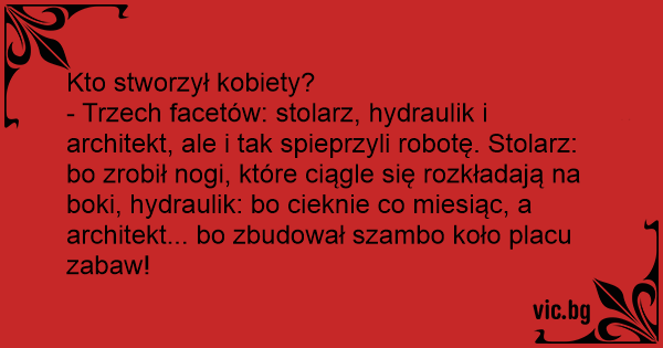 - Trzech facetów: stolarz, hydraulik i architekt, ale i tak spieprzyli robotę. Stolarz: bo zrobił nogi, które ciągle się rozkładają na boki, hydraulik: bo cieknie co miesiąc, a architekt... bo zbudował szambo koło placu zabaw!