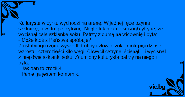 Kulturysta w cyrku wychodzi na arenę. W jednej ręce trzyma szklankę, a w drugiej cytrynę. Nagle tak mocno ścisnął cytrynę, że wycisnął całą szklankę soku. Patrzy z dumą na widownię i pyta: