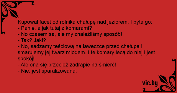- No, sadzamy teściową na ławeczce przed chałupą i smarujemy jej twarz miodem. I te komary lecą do niej i jest spokój!