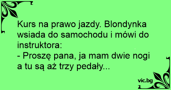 Kurs na prawo jazdy. Blondynka wsiada do samochodu i mówi do instruktora: