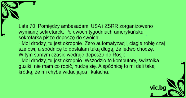 Lata 70. Pomiędzy ambasadami USA i ZSRR zorganizowano wymianę sekretarek. Po dwóch tygodniach amerykańska sekretarka pisze depeszę do swoich: