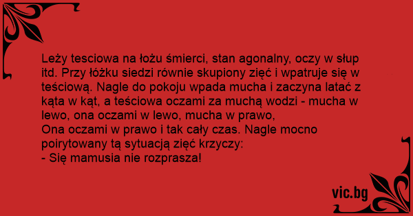 Leży tesciowa na łożu śmierci, stan agonalny, oczy w słup itd. Przy łóżku siedzi równie skupiony zięć i wpatruje się w teściową. Nagle do pokoju wpada mucha i zaczyna latać z kąta w kąt, a teściowa oczami za muchą wodzi - mucha w lewo, ona oczami w lewo, mucha w prawo,