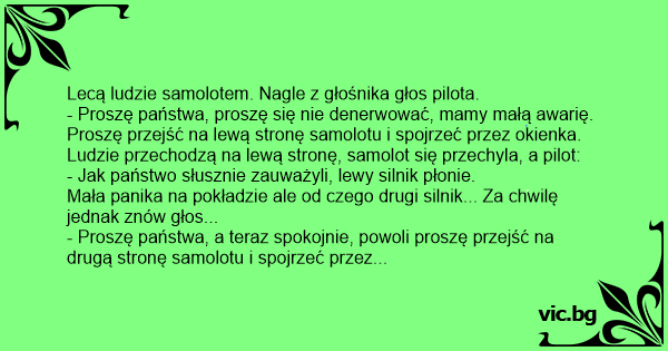 Lecą ludzie samolotem. Nagle z głośnika głos pilota.