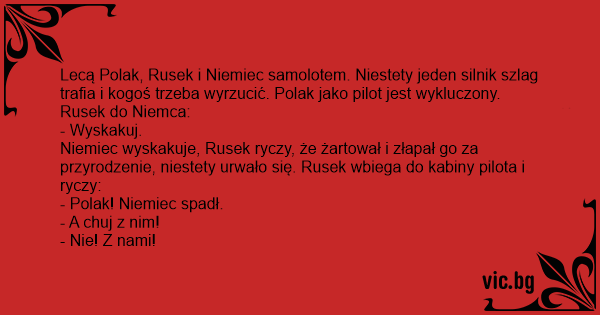 Lecą Polak, Rusek i Niemiec samolotem. Niestety jeden silnik szlag trafia i kogoś trzeba wyrzucić. Polak jako pilot jest wykluczony. Rusek do Niemca: