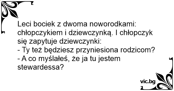 Leci bociek z dwoma noworodkami: chłopczykiem i dziewczynką. I chłopczyk się zapytuje dziewczynki: