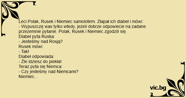 Leci Polak, Rusek i Niemiec samolotem. Złapał ich diabeł i mówi: