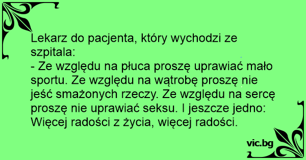 - Ze względu na płuca proszę uprawiać mało sportu. Ze względu na wątrobę proszę nie jeść smażonych rzeczy. Ze względu na sercę proszę nie uprawiać seksu. I jeszcze jedno: Więcej radości z życia, więcej radości.