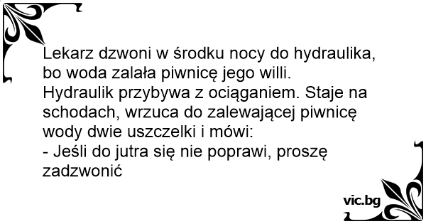 Rohrbruch beim Arzt Отива един водопроводчик при лекаря си на 31 декември: Ein Arzt ruft mitten in der Nacht beim Installateur an, weil er Wasser im Keller hat. Dieser kommt, guckt, wirft ein paar Dichtungsringe ins Wasser und sagt: "Wenn’s morgen nicht besser ist, melden Sie sich nochmal!" Няколко часа до настъпването на Нова година. В дома на лекар се запушва тоалетната. Лекарят звъни на водопроводчик. – Извинете, запуши ми се тоалетната, можете ли да ми помогнете? – Ти луд ли си бе, до Нова година остават два часа! – Ами ние какво? По всяко време, при всякакви метеорологични... Ein Arzt stellt mitten in der Nacht fest, dass sein Keller unter Wasser steht. Sofort ruft er einen Klempner an. Dieser weigert sich allerdings, zu dieser späten Stunde noch zu kommen. Daraufhin... Tohtorin joulu meni pilalle kun viemäri tukkeutui. Hän soitti putkimiehelle ja pyysi tätä apuun. Mutta nythän on jouluaatto, mutisi putkimies. Entä sitten? Jos te sairastutte, minä tulen heti... Een huisarts belt in een weekend een loodgieter met de vraag of hij direct wil komen, want hij heeft water in de kelder. De loodgieter probeert de huisarts af te wimpelen en vraagt of dat niet kan... Csőtörés van egy orvos villájában. A doki telefonon hívja az ismerős csőszerelőt. - Azonnal ugorj kocsiba, csőtörés van nálunk, a pincében már minden úszik! - Nem mehetek, tudod hogy ünnepelünk.... Egy orvos az éjszaka közepén felkel és kimegy a vécére. Meglepődve látja, hogy eldugult a toalett. Felébreszti a feleségét: - Drágám, eldugult a vécé, hívjuk ki a vízszerelőt! - Megőrültél? Hajnali... Um medico esta com um vazamento no banheiro que esta preocupando bastante. e obvio, ele só percebe isso quando chega em casa, depois da meia-noite. assim mesmo ele liga para o encanador. o... På selveste nyttårsaften ble rørene тетте hjemme hos distriktslegen. Han ringte straks til rørleggeren Andersen og ba om hjelp. - Nei!sa rørlegger Andersen. Jeg vil ikke ut på jobb på selveste...