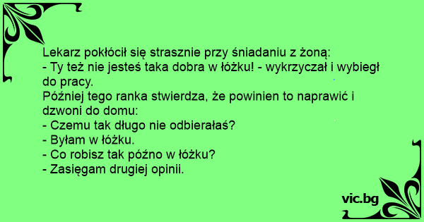 Мажот решил да и се извини на жената Δεύτερη ερωτική γνώμη Δεύτερη γνώμη Семеен скандал на закуска. Мъжът ядосан става от масата: C'est un docteur et sa femme qui ont une violente dispute le matin. Le médecin finit par hurler à sa femme: - Tu es nulle au lit ... et il s'en va au boulot. Dans la matinée, pris par les remords, il décide d'appeler sa femme au téléphone pour s'excuser et tenter de faire la paix. Le téléphone... Pelea de la pareja durante el desayuno! Después de una discusión, el marido sale para su trabajo y le grita a la esposa: - Y para que sepas: Ni siquiera en la cama sos buena !!!!!!! Pasado algun... Depois de uma briga horrível, o marido sai para o trabalho gritando: — E tem mais: nem boa de cama você é! Depois de algum tempo, ele se arrepende e liga pra casa, pra se desculpar. O telefone toca... Een arts en zijn vrouw bedrijven de liefde en na afloop zegt hij: “je kan er niets van!” De vrouw stapt kwaad uit bed. Later die dag op zijn praktijk krijgt de arts toch spijt van wat hij heeft... Un matin, juste avant de partir à son cabinet, un médecin s'engueule copieusement avec son épouse. Avant de claquer la porte, il lui lance : - Ah, il faut que je te dise encore une chose... Tu es... A husband and his wife were having a big argument at breakfast. “You aren’t so good in bed either!” he shouted and stormed off to work. By midmorning, he decided he’d better make amends and phoned... Мажот, лекар се кара со својата жена, домаќинка за време на појадокот, бесен бега од масата и вели: - И да знаеш, воопшто не си добра во кревет! На работа сваќа дека претерал и дека треба да се... Un tip si sotia lui se cearta De zor la micul dejun: - Si daca vrei sa Stii, nici nu esti foarte bun la pat! ii spune ea si Pleaca la lucru trantind usa. Pe la amiaza Incepe sa-i para rau si suna...