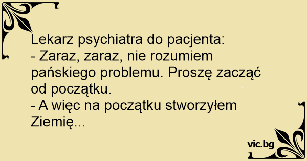 U psychiatry: - Trochę się pogubiłem w Pańskiej historii. Czy mógłby Pan zacząć od początku? - No dobrze. A więc, na początku stworzyłem ziemię...