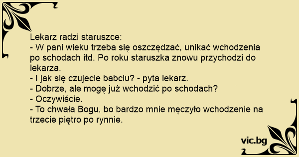 - W pani wieku trzeba się oszczędzać, unikać wchodzenia po schodach itd. Po roku staruszka znowu przychodzi do lekarza.