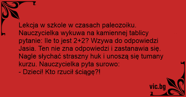 Lekcja w szkole w czasach paleozoiku. Nauczycielka wykuwa na kamiennej tablicy pytanie: Ile to jest 2+2? Wzywa do odpowiedzi Jasia. Ten nie zna odpowiedzi i zastanawia się. Nagle słychać straszny huk i unoszą się tumany kurzu. Nauczycielka pyta surowo: