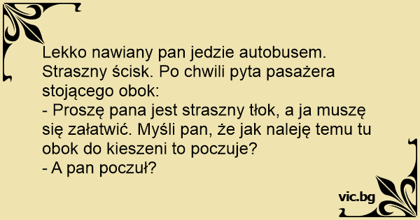 Lekko nawiany pan jedzie autobusem. Straszny ścisk. Po chwili pyta pasażera stojącego obok: