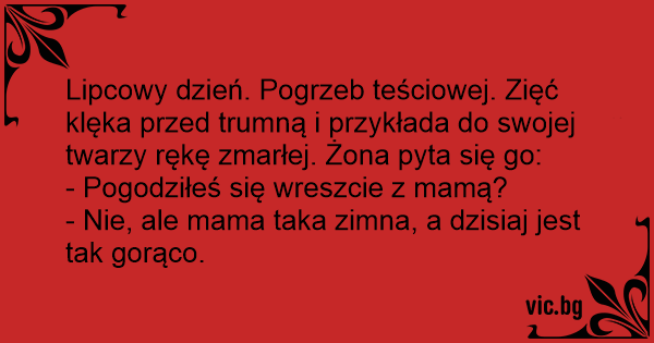 Lipcowy dzień. Pogrzeb teściowej. Zięć klęka przed trumną i przykłada do swojej twarzy rękę zmarłej. Żona pyta się go: