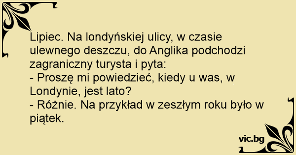 Lipiec. Na londyńskiej ulicy, w czasie ulewnego deszczu, do Anglika podchodzi zagraniczny turysta i pyta: