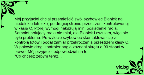 Mój przyjaciel chciał przemieścić swój szybowiec Blanick na niedalekie lotnisko, po drugiej stronie przestrzeni kontrolowanej w kasie C, której wymogi nakazują min. posiadanie radia. Samolot holujący radia nie miał, ale Blanick i owszem, więc nie było problemu. Po wylocie szybowiec skontaktował się z kontrolą lotów i podał zamiar przekroczenia przestrzeni klasy C. W połowie drogi kontroler nagle zażądał skrętu o 90 stopni w prawo. Mój przyjaciel odpowiedział na to: