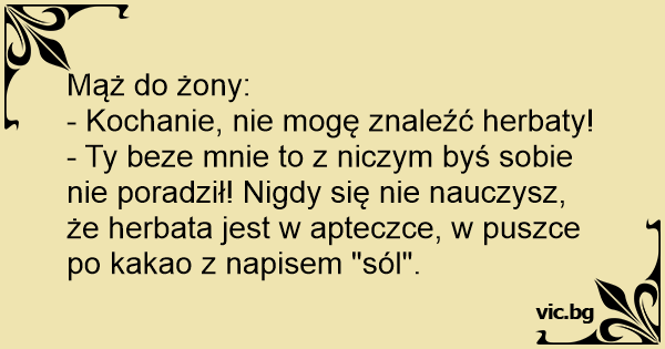 - Ty beze mnie to z niczym byś sobie nie poradził! Nigdy się nie nauczysz, że herbata jest w apteczce, w puszce po kakao z napisem "sól".