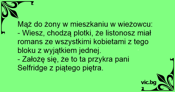 - Chodzą plotki, że listonosz miał romans ze wszystkimi kobietami z tego bloku, z wyjątkiem jednej - mówi mąż do żony. - Założę się, że nie zapukał do tej brzydkiej Kowalskiej z drugiego piętra...