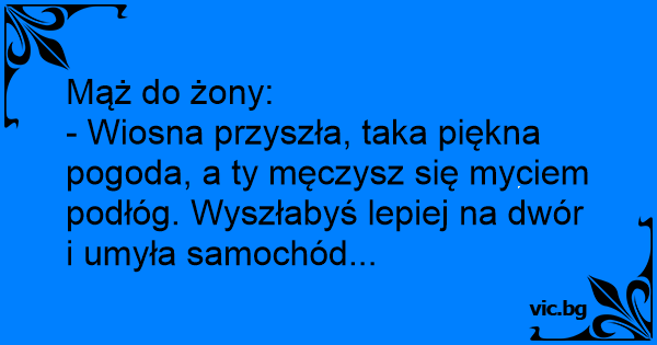 - Wiosna przyszła, taka piękna pogoda, a ty męczysz się myciem podłóg. Wyszłabyś lepiej na dwór i umyła samochód...