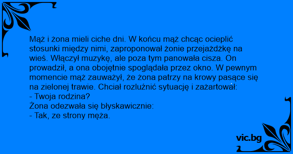 Mąż i żona mieli ciche dni. W końcu mąż chcąc ocieplić stosunki między nimi, zaproponował żonie przejażdżkę na wieś. Włączył muzykę, ale poza tym panowała cisza. On prowadził, a ona obojętnie spoglądała przez okno. W pewnym momencie mąż zauważył, że żona patrzy na krowy pasące się na zielonej trawie. Chciał rozluźnić sytuację i zażartował: