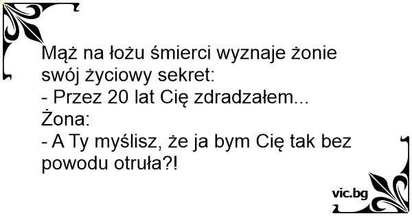 A férj halálos ágyán: - Drágám be kell valljak valami! - Mit drágám? - Sajnos megcsaltalak. - Tudom drágám, ezért mérgeztelek meg.