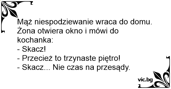 Жена е с любовника си в леглото. Звъни се на вратата. Тя: - Бързо, скачай през балкона. - Какво? На тринадесетия етаж сме!!! - Скачай, скачай, няма време за суеверия сега.