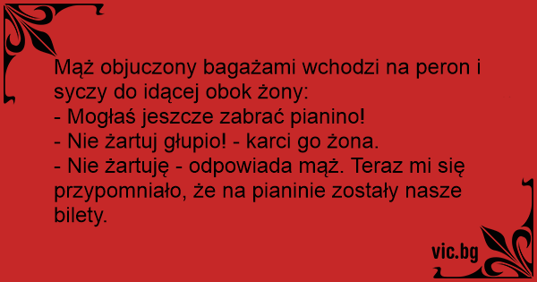 - Nie żartuję - odpowiada mąż. Teraz mi się przypomniało, że na pianinie zostały nasze bilety.