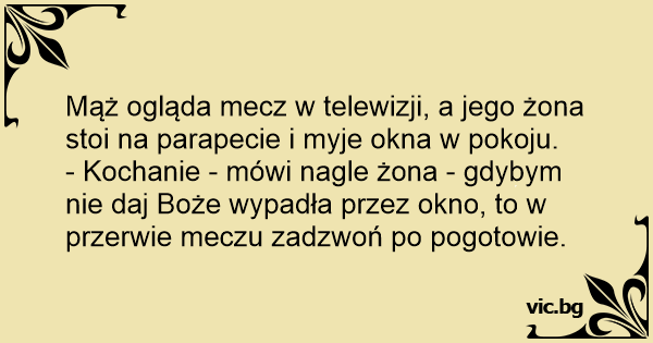 - Kochanie - mówi nagle żona - gdybym nie daj Boże wypadła przez okno, to w przerwie meczu zadzwoń po pogotowie.