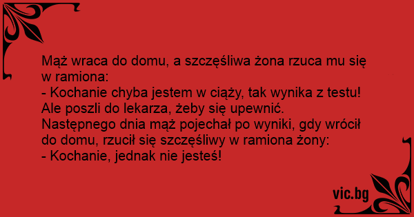 Następnego dnia mąż pojechał po wyniki, gdy wrócił do domu, rzucił się szczęśliwy w ramiona żony: