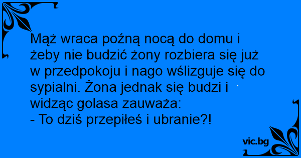 Mąż wraca poźną nocą do domu i żeby nie budzić żony rozbiera się już w przedpokoju i nago wślizguje się do sypialni. Żona jednak się budzi i widząc golasa zauważa: