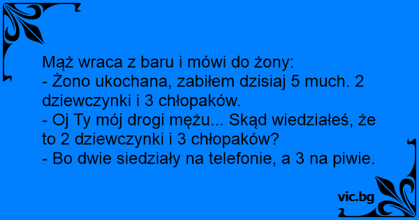 - Żono ukochana, zabiłem dzisiaj 5 much. 2 dziewczynki i 3 chłopaków.