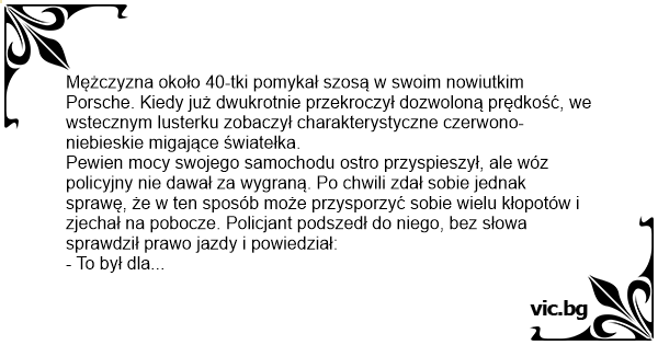 Pewien mocy swojego samochodu ostro przyspieszył, ale wóz policyjny nie dawał za wygraną. Po chwili zdał sobie jednak sprawę, że w ten sposób może przysporzyć sobie wielu kłopotów i zjechał na pobocze. Policjant podszedł do niego, bez słowa sprawdził prawo jazdy i powiedział: