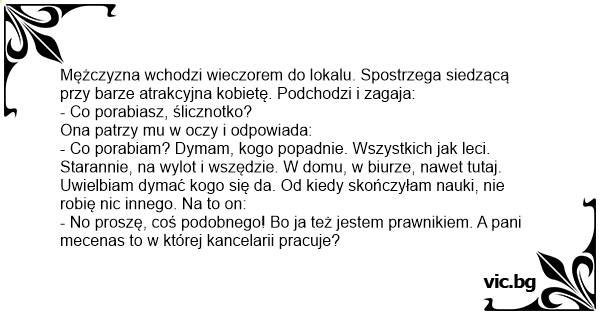 Mężczyzna wchodzi wieczorem do lokalu. Spostrzega siedzącą przy barze atrakcyjna kobietę. Podchodzi i zagaja: