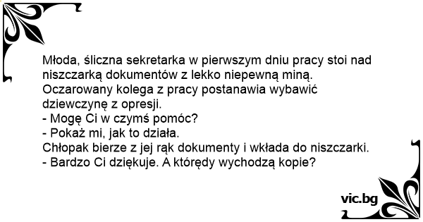 W biurze nad niszczarką dokumentów stoi szef i myśli. Obok przechodzi sekretarka-blondynka, i pyta: - Może w czymś pomóc dyrektorze? - Owszem. Mam tu ważne dokumenty, ale nie wiem, jak ta maszyna...